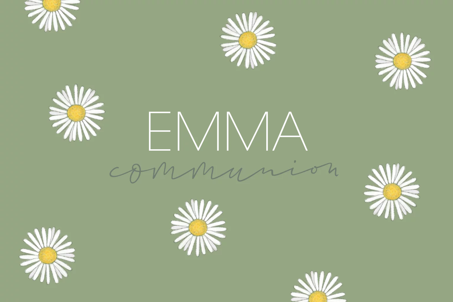 Faire-part communion avec paquerettes, fond vert, et dorure
