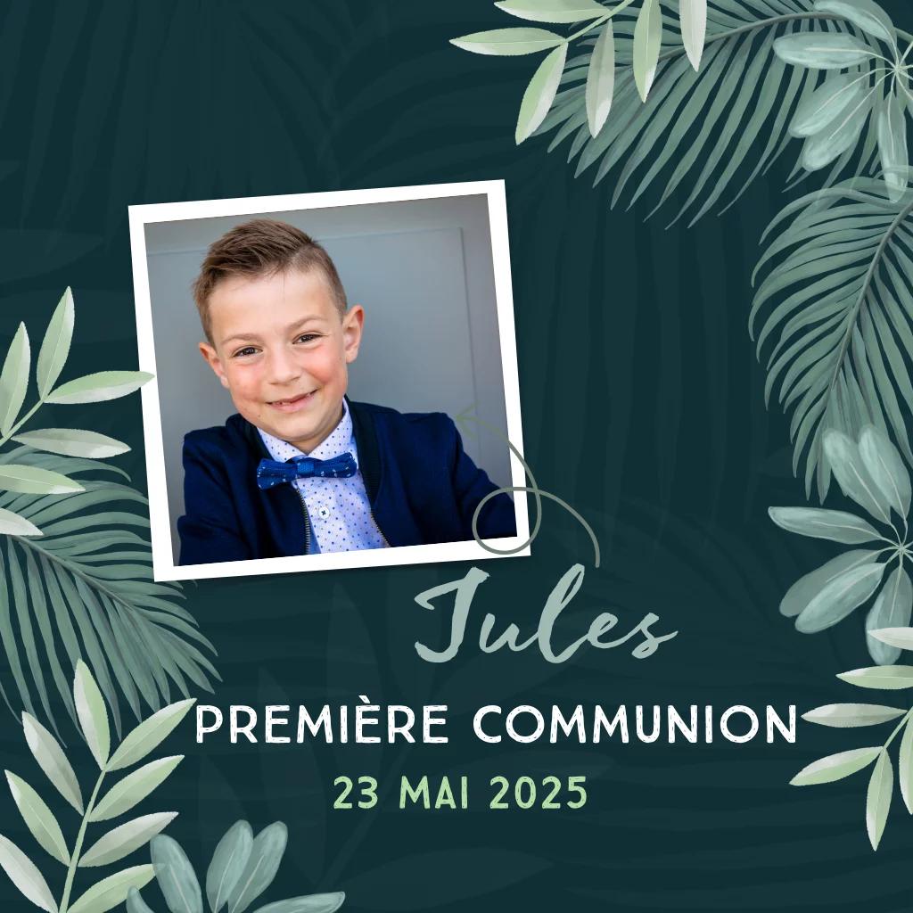 Faire-part de communion avec photo et branches sur fond vert foncé.