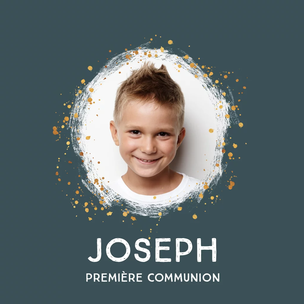 Faire-part de communion avec photo et couronne d'éclaboussures d'or.