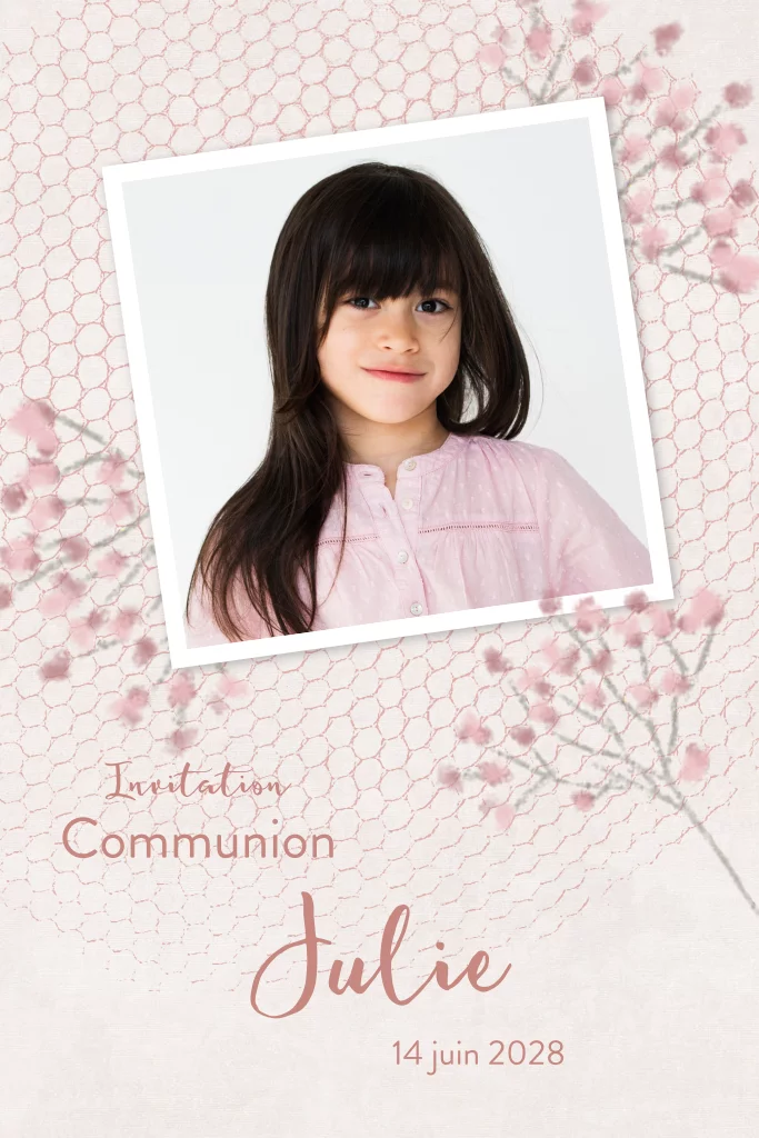 Faire-part de communion rose avec photo sur fond de nid d'abeille.