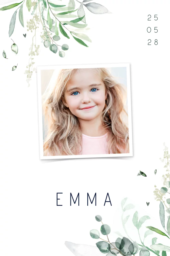 Faire-part de communion avec photo, dorures et branches d'eucalyptus