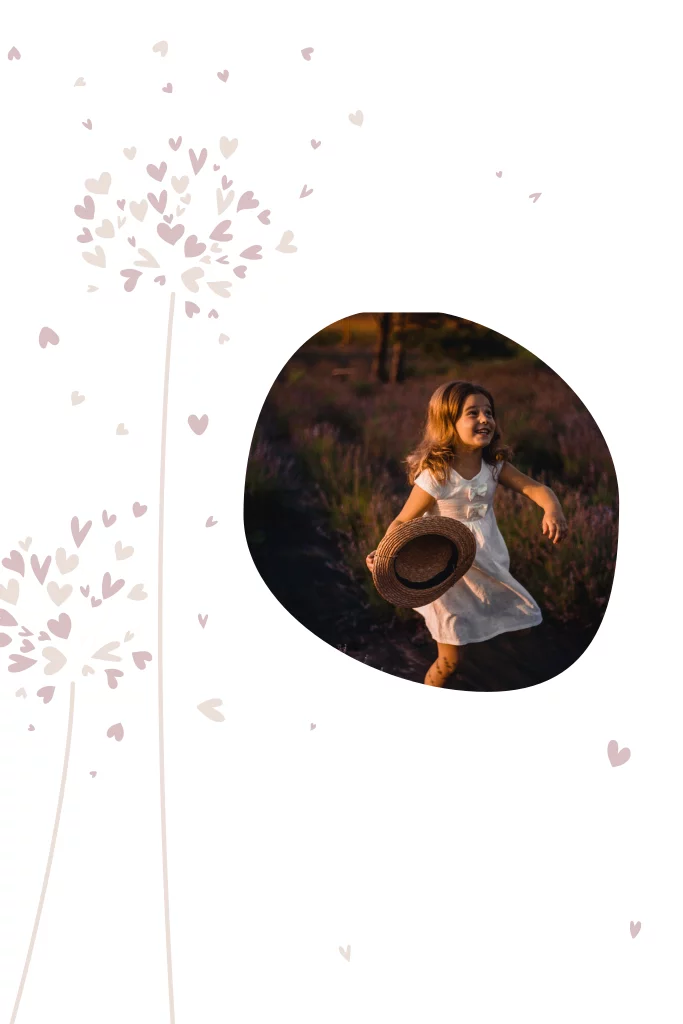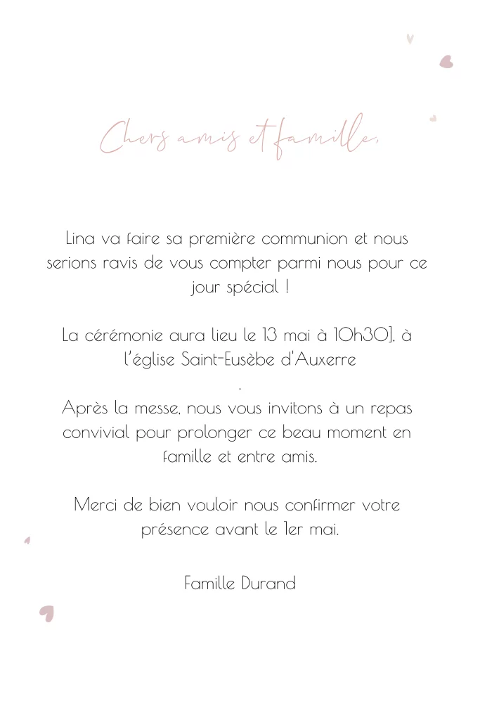 Faire-part de communion avec fleurs faites de cœurs et photo