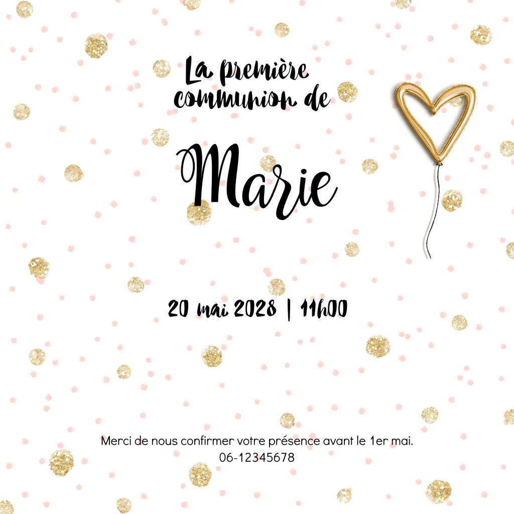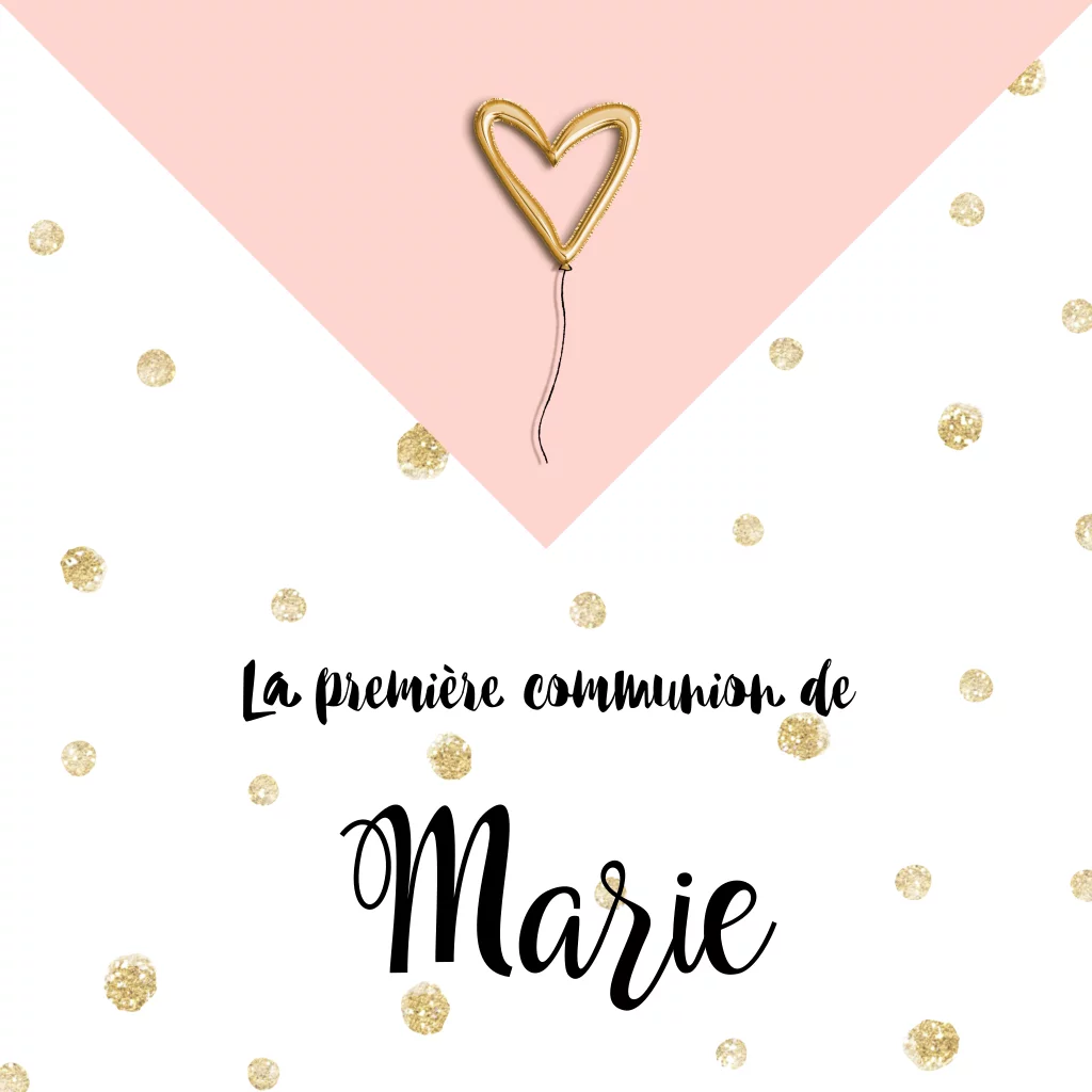Faire-part de communion avec cœur et confetti doré.