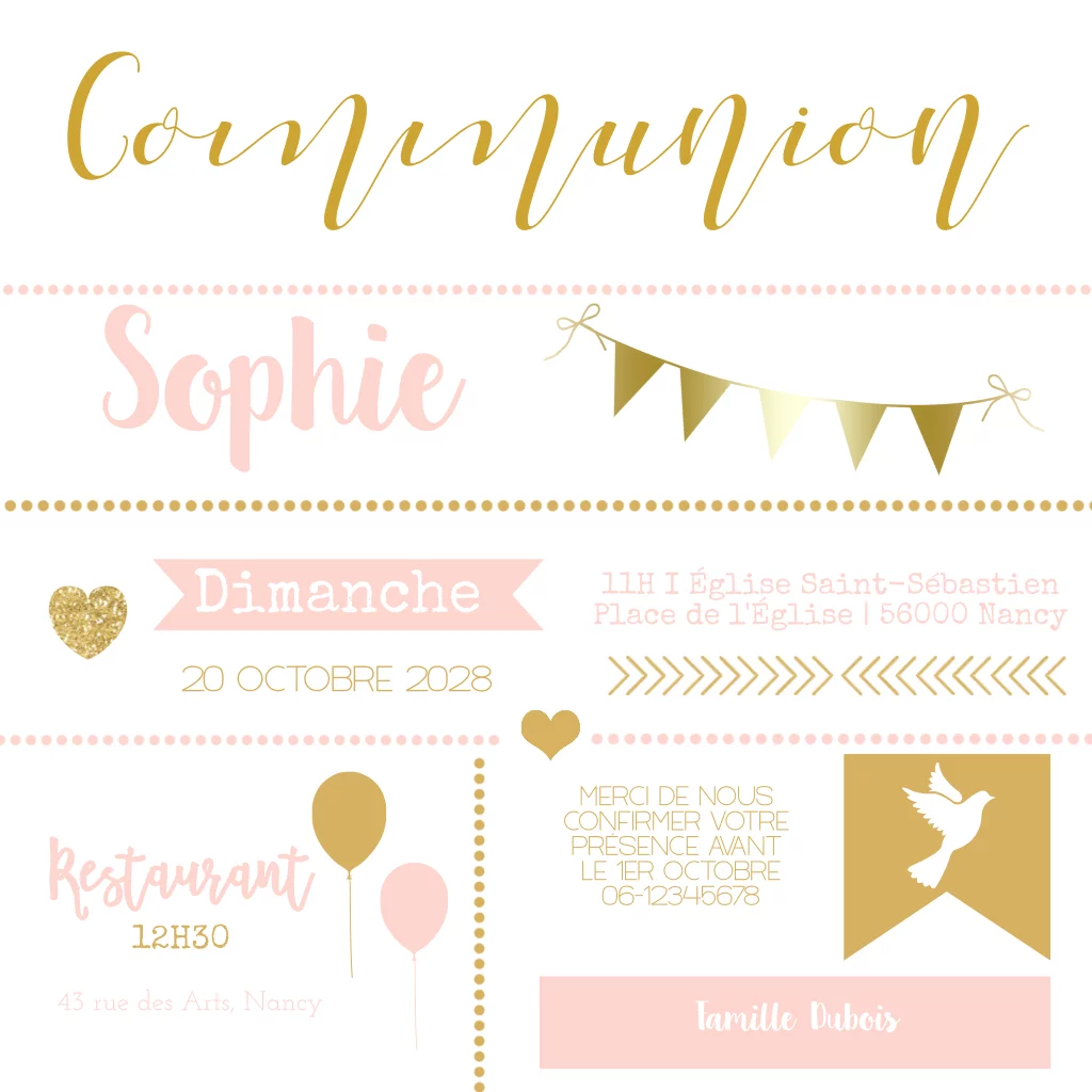 Faire-part de communion moderne avec décorations festives et colombe.