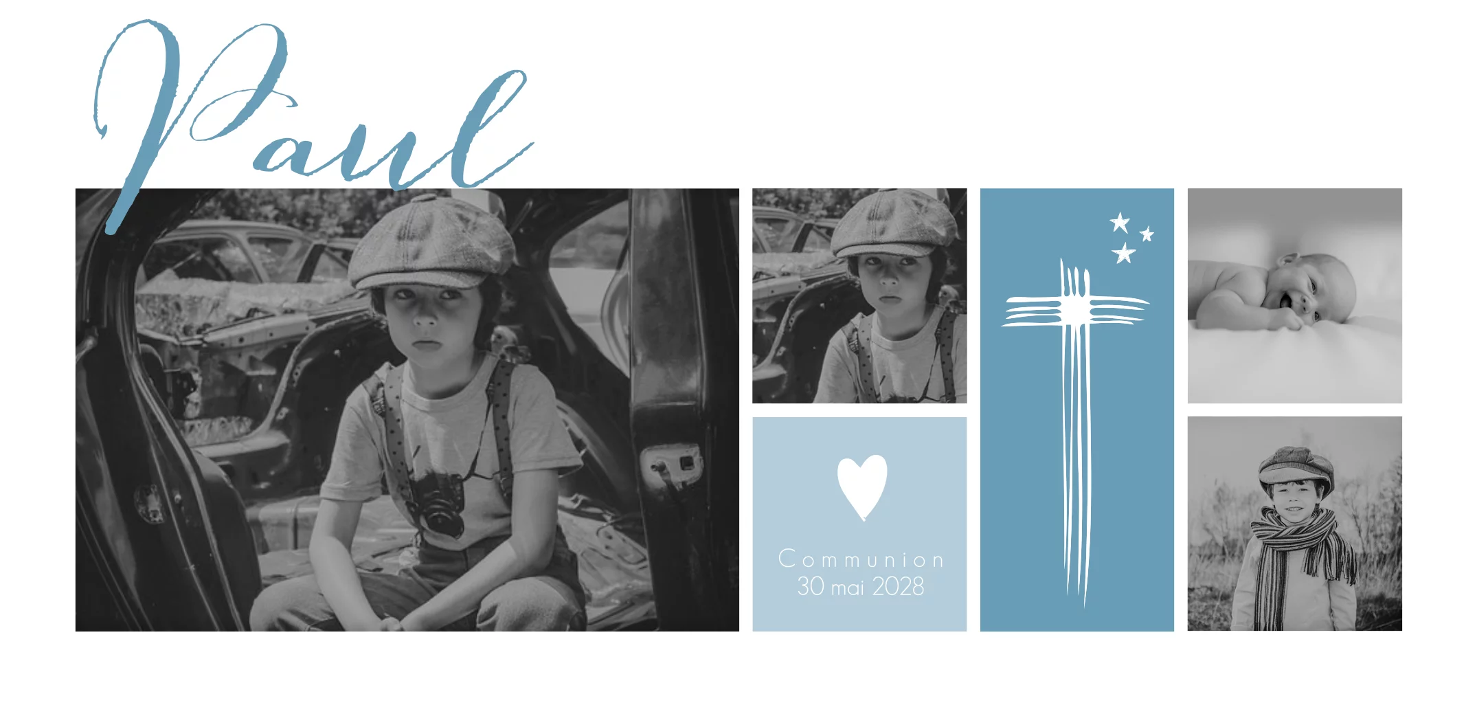 Faire-part de communion avec photos, croix et détails bleus