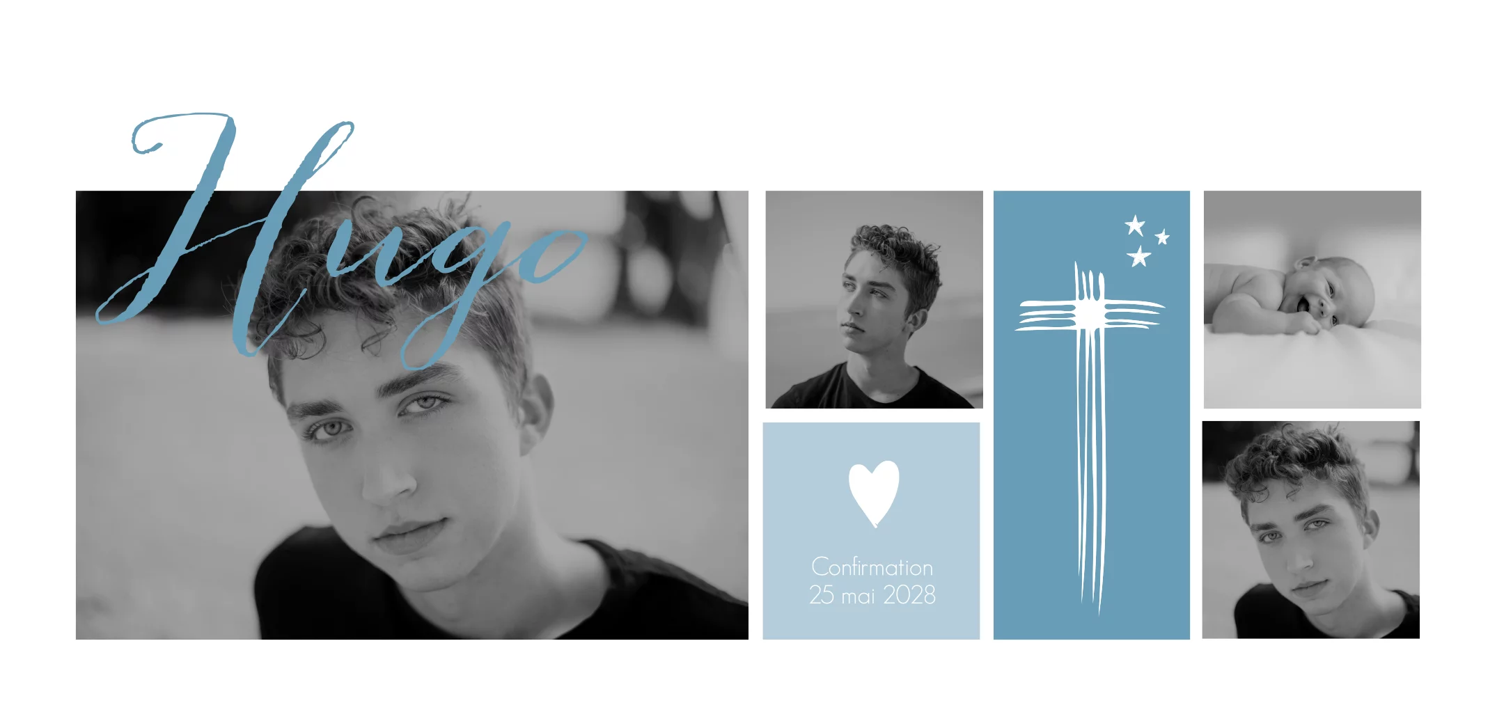 Faire-part de confirmation avec collage de photos et détails bleus.