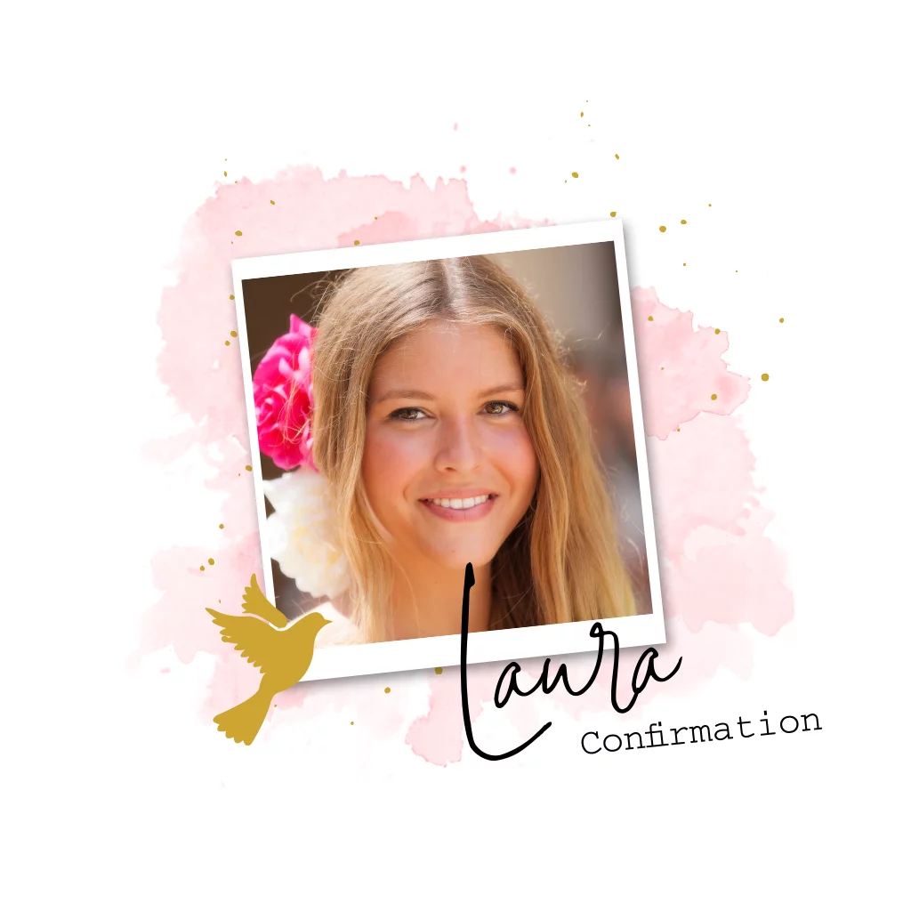 Faire-part de confirmation avec photo et colombe sur aquarelle rose.