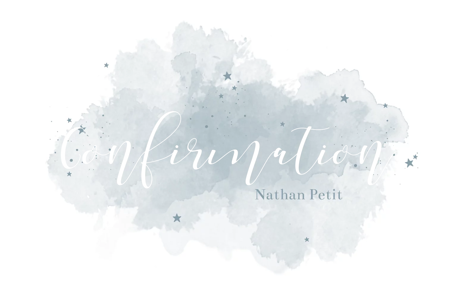 Faire-part de confirmation sur fond aquarelle bleu avec des dorures.
