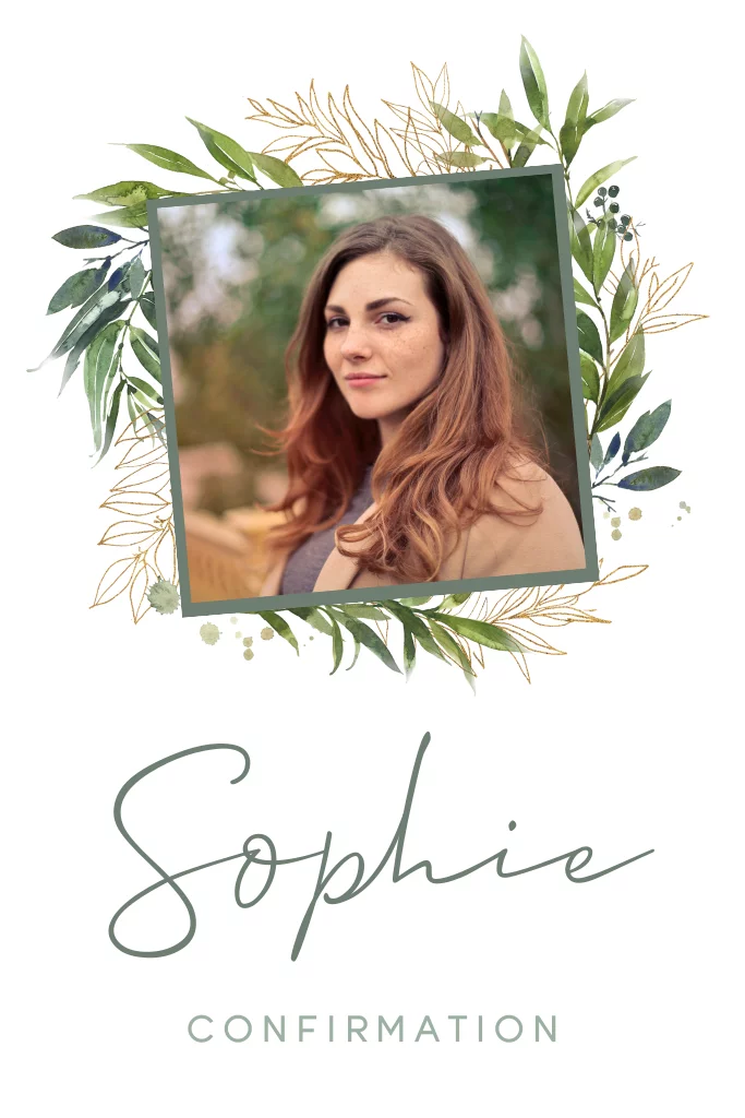 Faire-part de confirmation avec photo dans un cadre de rameaux d’olivier.