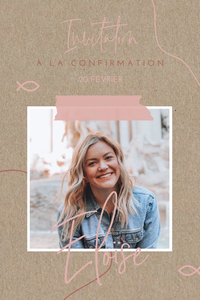 Faire-part de confirmation sur papier kraft avec ichthus en rose