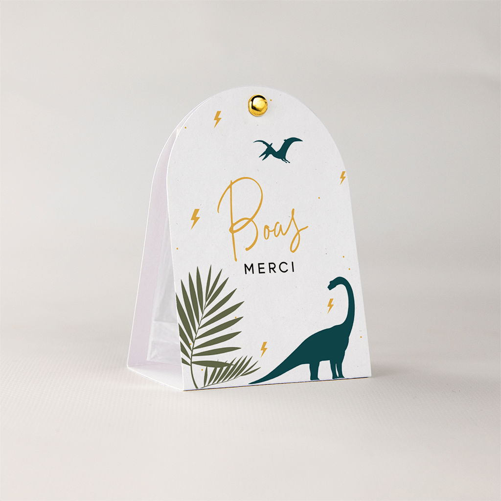 Boîte à dragées remerciement avec feuillages, dinosaure et éclairs