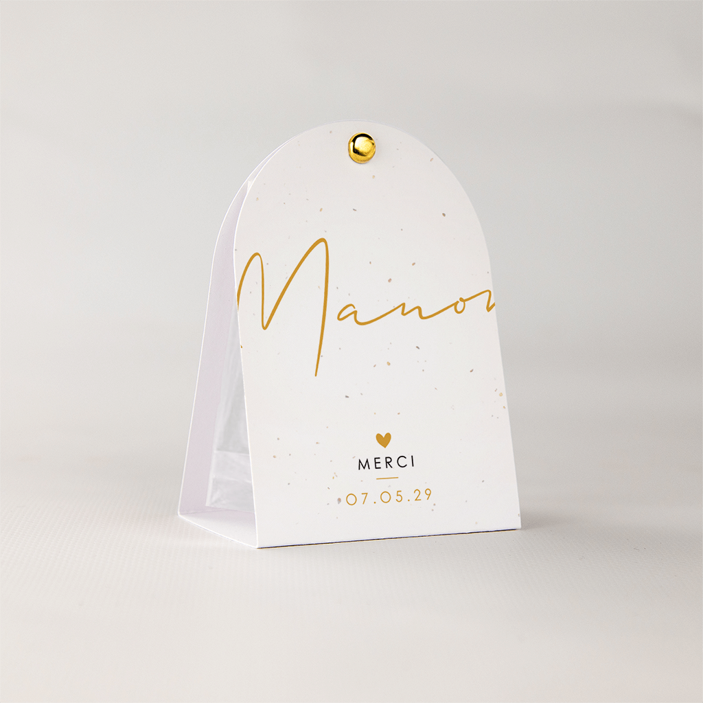 • Les deux faces peuvent être fermées à l'aide d'une attache parisienne et la boîte à dragées peut être complétée d'un sachet transparent pour les dragées.