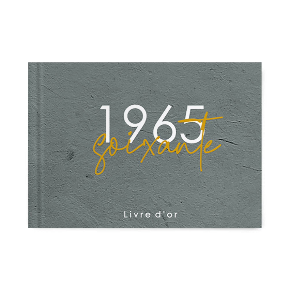 Livre d'or anniversaire avec date sur fond gris bleu.