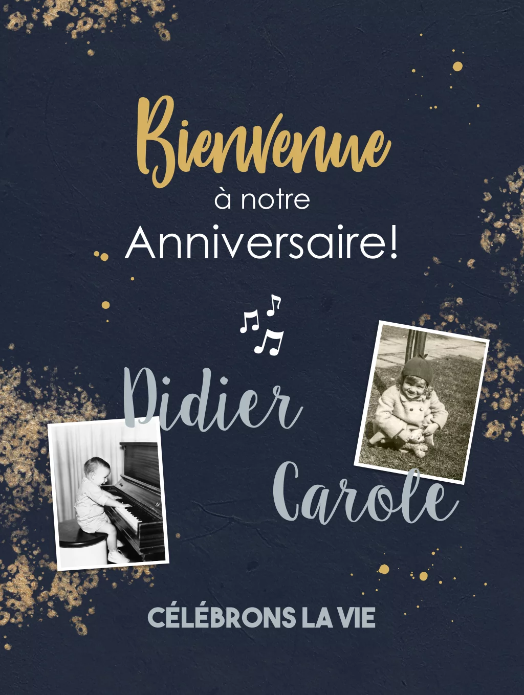 Panneau de bienvenue anniversaire avec photos sur fond foncé.