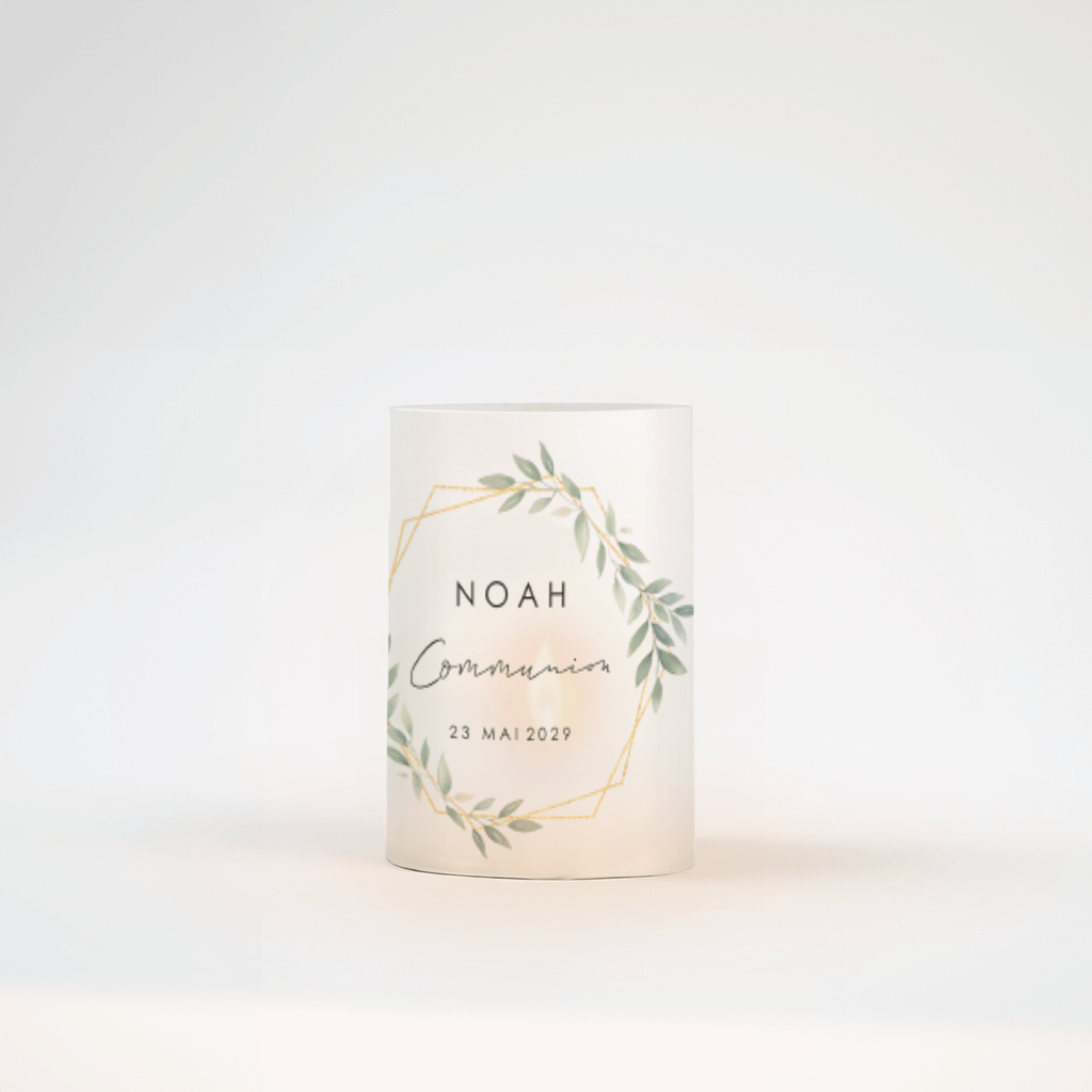 Photophore communion avec feuillages, forme géométrique et prénom