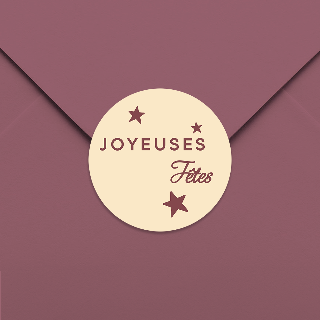 Autocollant "Joyeuses fêtes" avec étoiles, bordeaux sur fond beige – 25 ex.