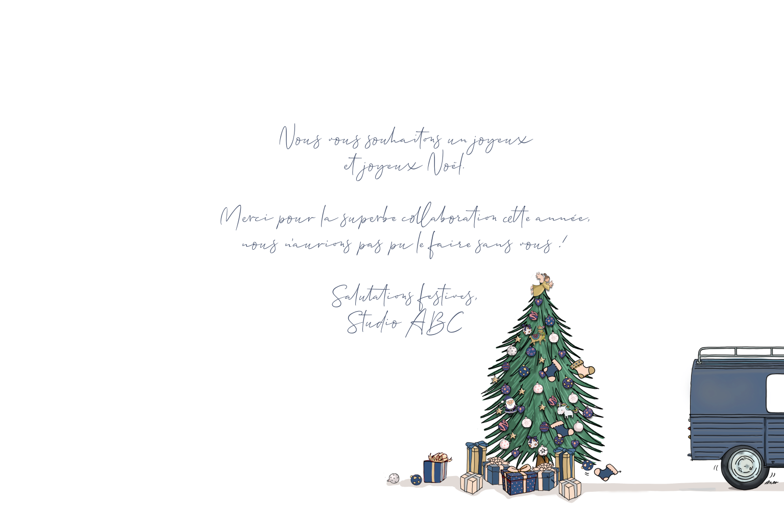Carte de Noël professionnelle avec une voiture remplie de cadeaux.