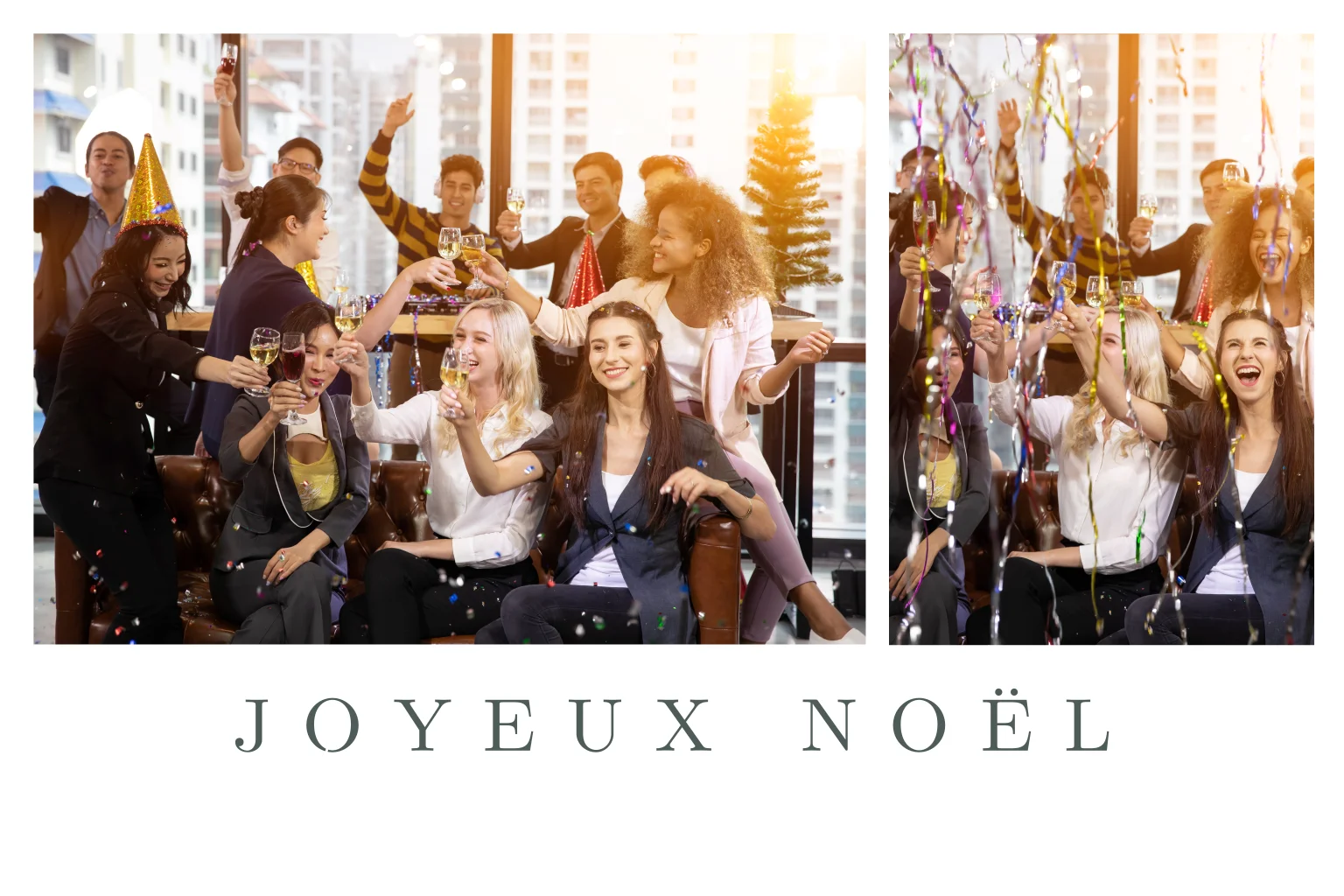 Carte de Noël professionnelle élégante avec des écritures dorées.