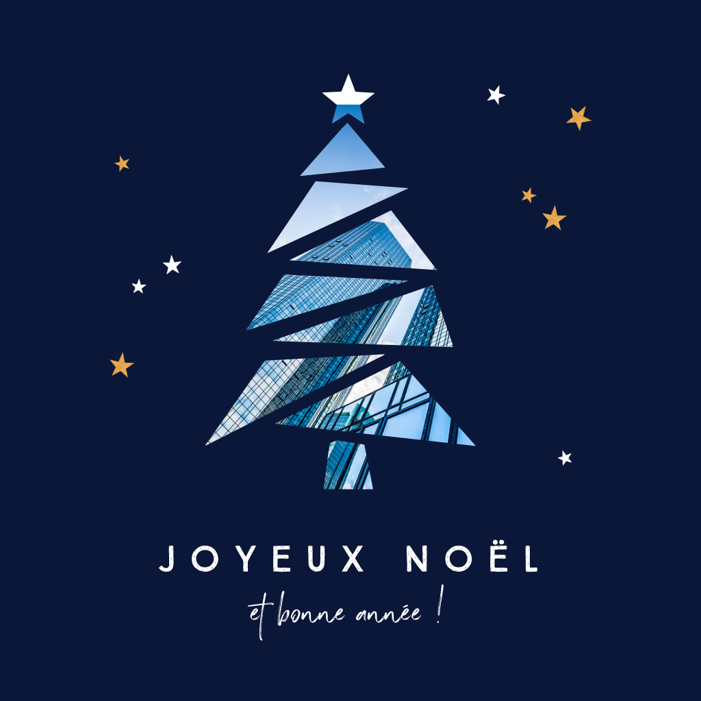 Carte de Noël professionnelle moderne bleu foncé avec un sapin de Noël.