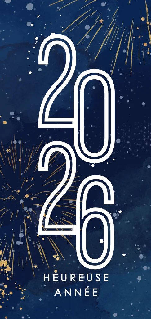Carte de vœux professionnelle avec des dorures et feux d'artifice.
