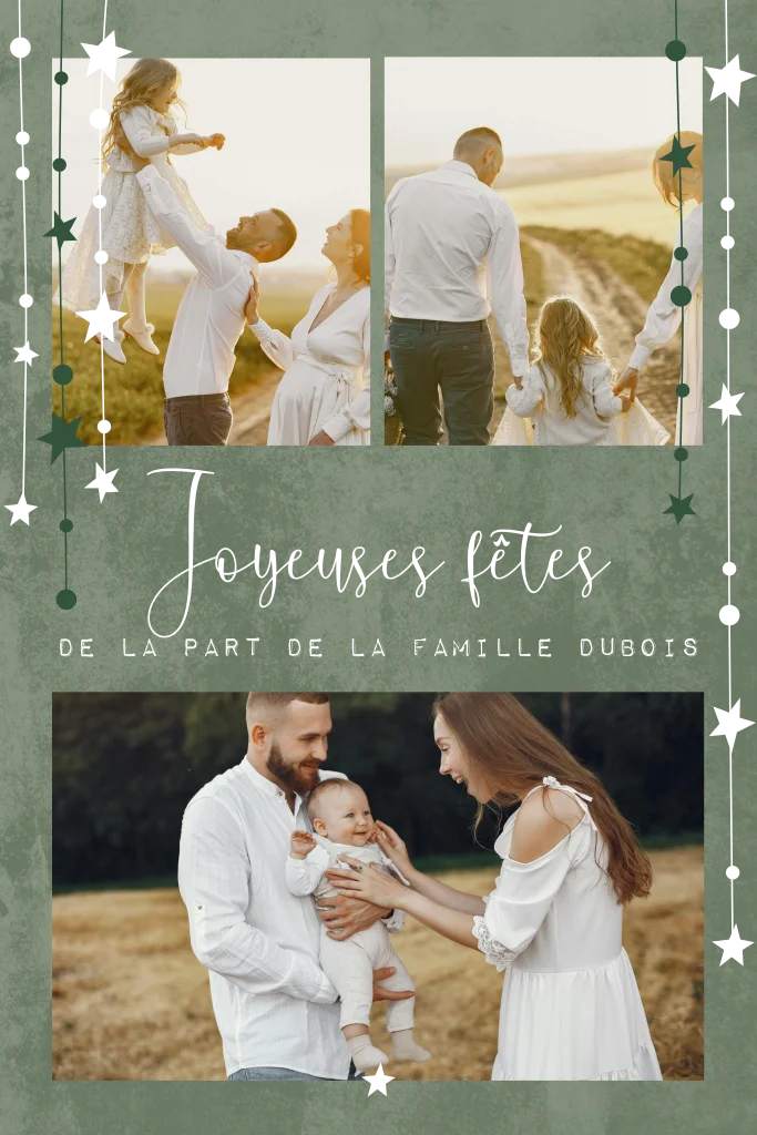 Carte de Noël avec fond vert, guirlandes étoiles et photos