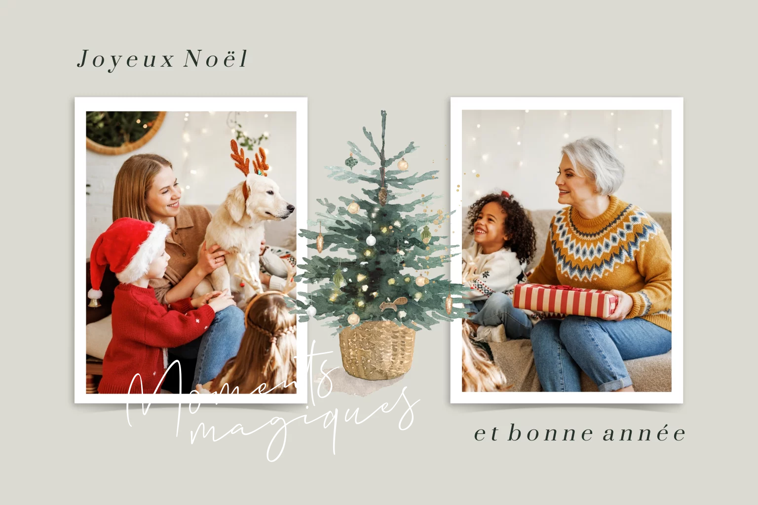Carte de voeux avec deux photos, sapin de Noël et détails dorés