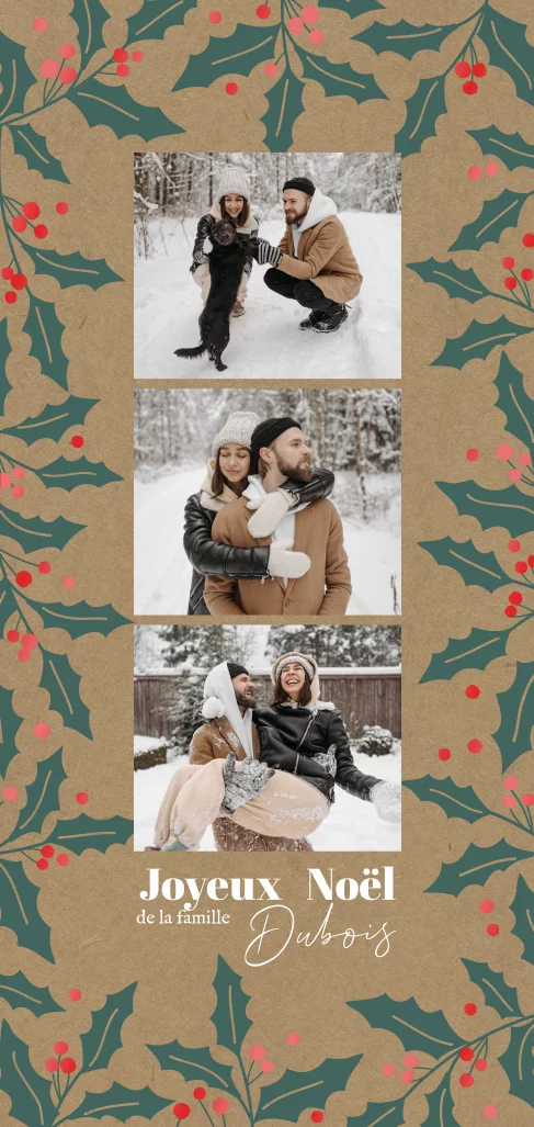 Carte de voeux avec trois photos, des rameaux de Noël et un message à personnaliser