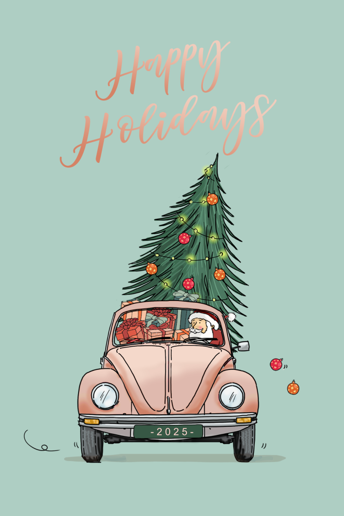Carte de Noël jolie avec une Coccinelle et un sapin de Noël.