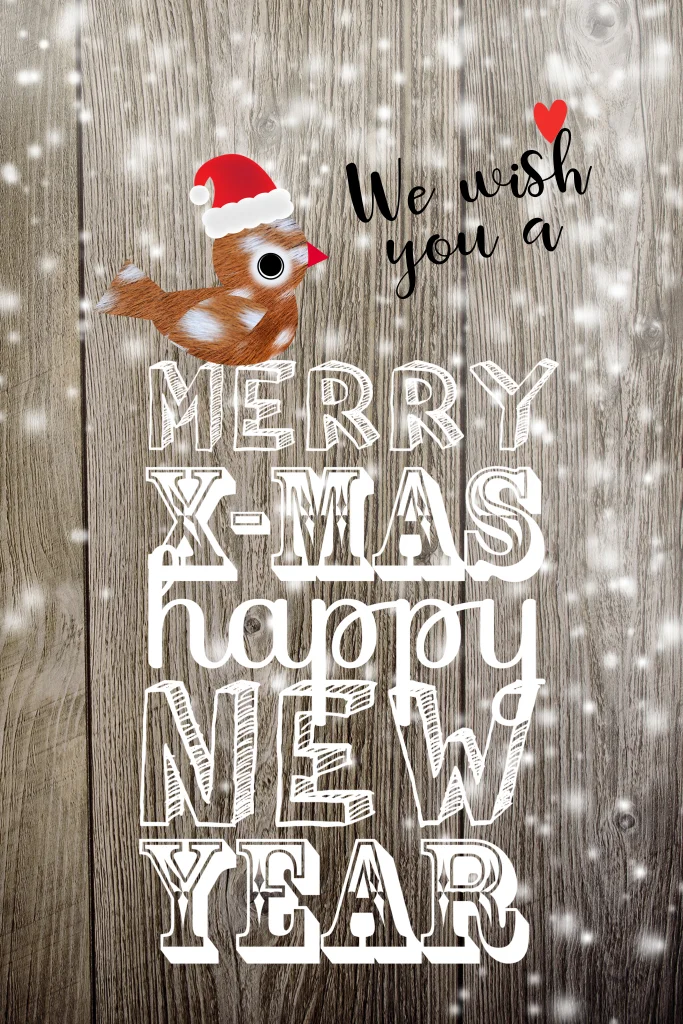 Carte de Noël avec un petit oiseau et de la neige sur fond en bois.