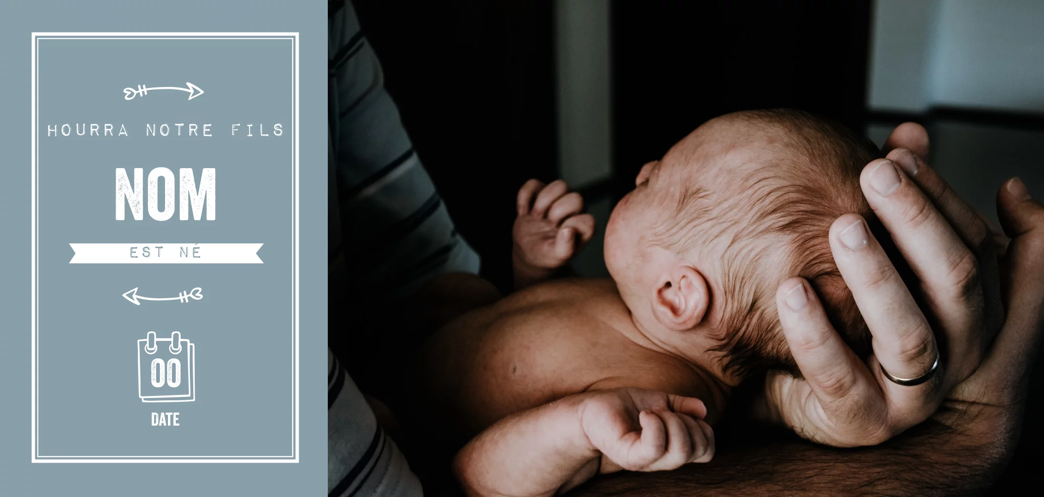 Joli faire-part de naissance en bleu-gris avec photo et symboles