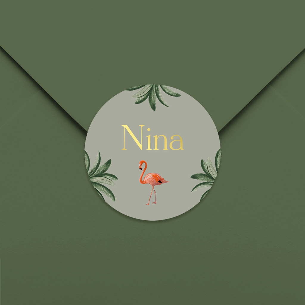 Joli autocollant rond avec un nom en dorure. En dessous, un flamant rose et sur les côtés des feuilles vertes que l'on trouve dans la jungle.