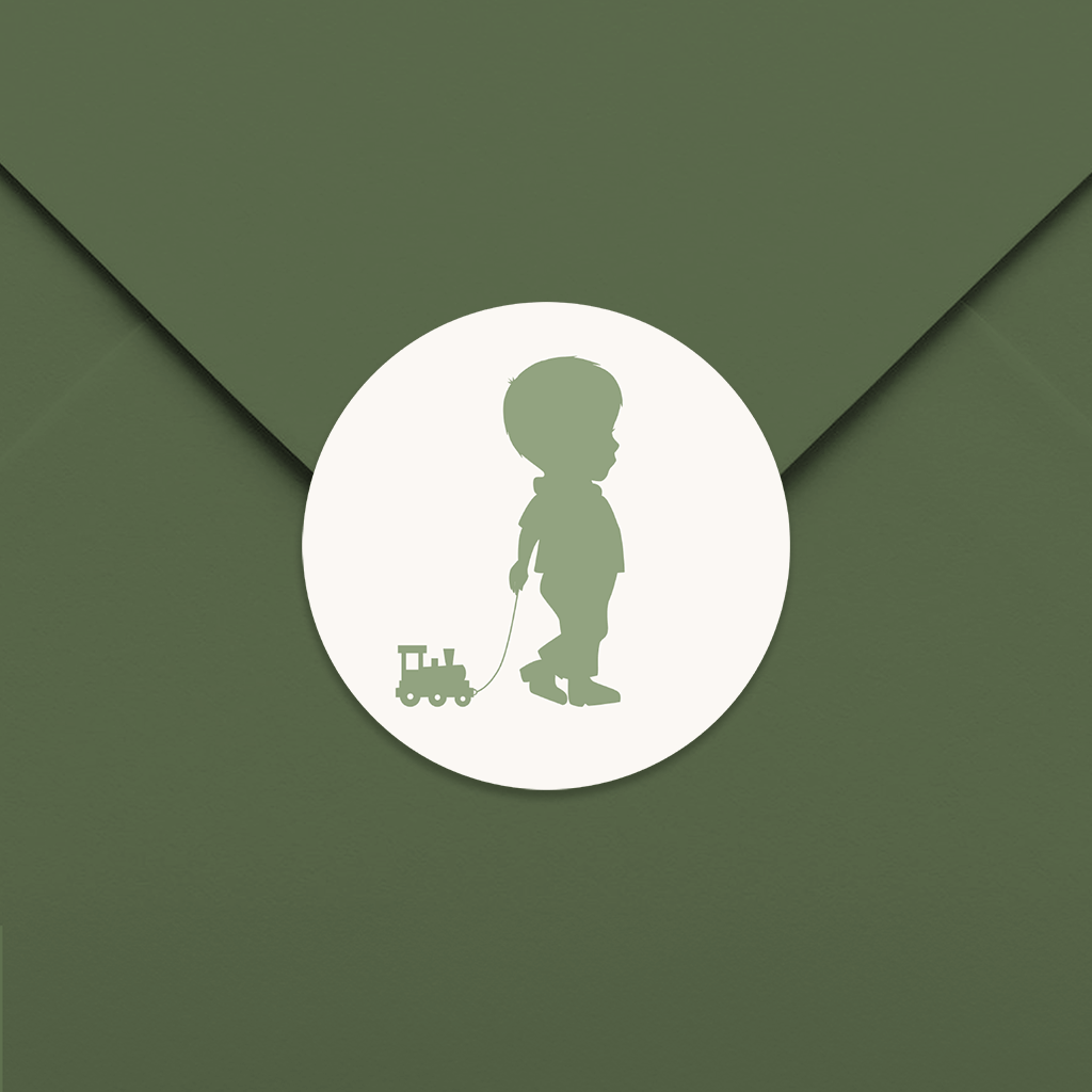 Autocollant vert avec silhouette d'un garçon avec un petit train - 20 ex. ø 44 mm.