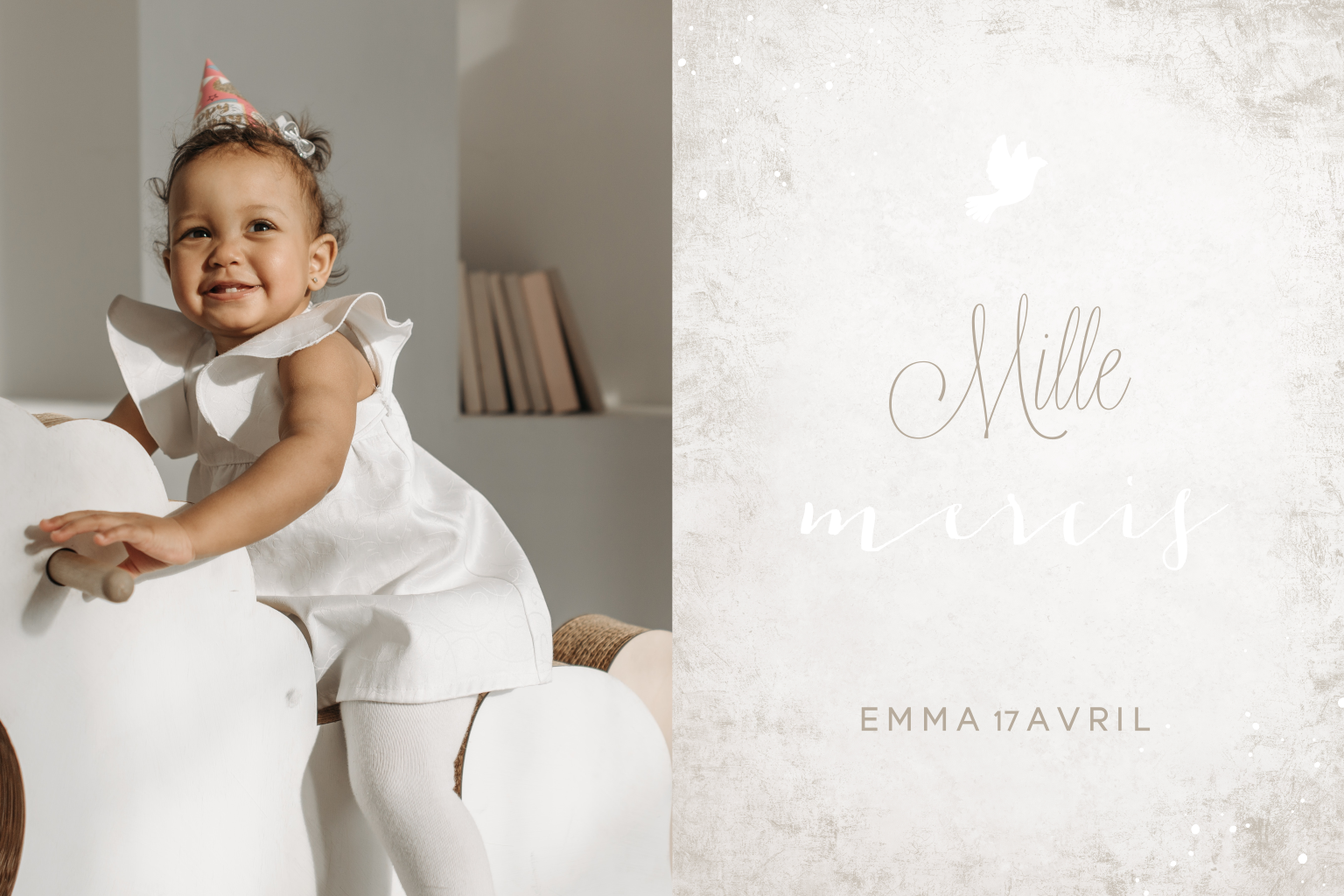 Carte de remerciement de baptême avec photo et colombe en dorure