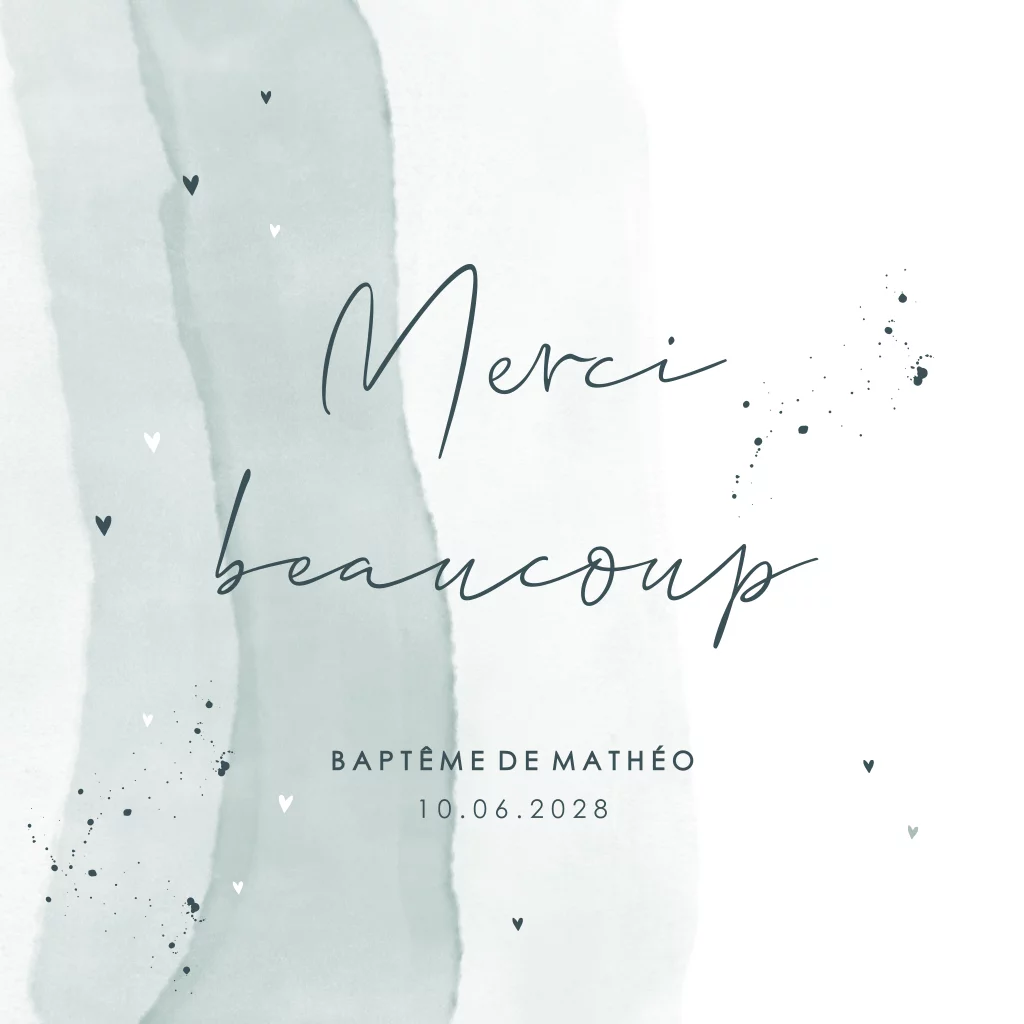 Jolie carte de remerciement pour le baptême dans des tons verts à l'aquarelle et des petits cœurs.