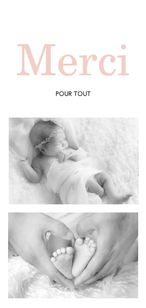 Cette jolie carte de remerciement présente fièrement deux magnifiques photos de votre enfant. Au recto, vous pourrez placer votre texte sur un charmant fond rose. Une façon douce et personnelle de remercier la famille et les amis.