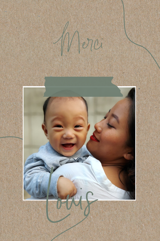Carte de remerciement avec un aspect kraft, des lignes vertes foncées et photo.