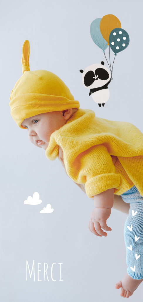 Carte de remerciement avec une photo de bébé, ballons et panda
