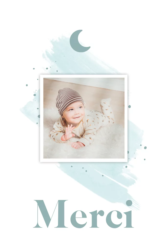 Carte de remerciement avec photo de bébé, lune bleue et coins arrondis.