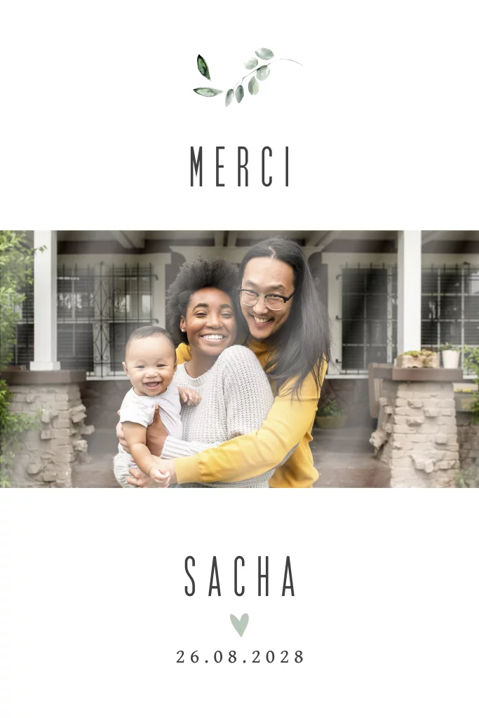 Carte de remerciement naissance avec feuille d'eucalyptus.