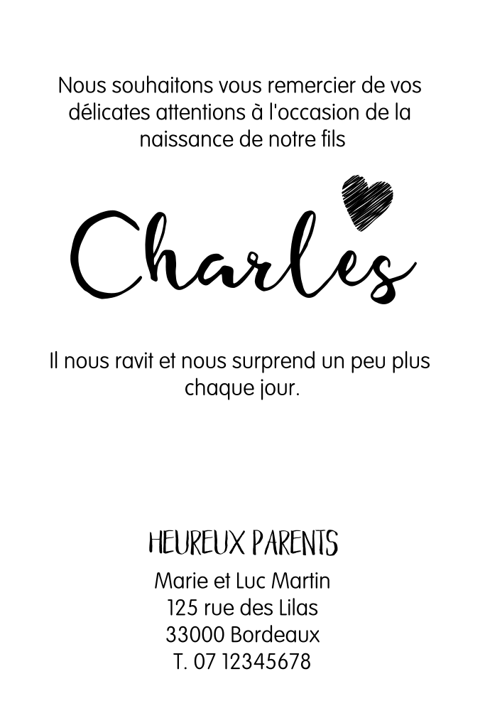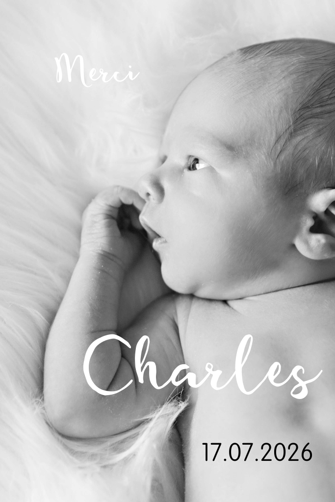 Carte de remerciement de naissance avec une grande photo et merci en dorure.