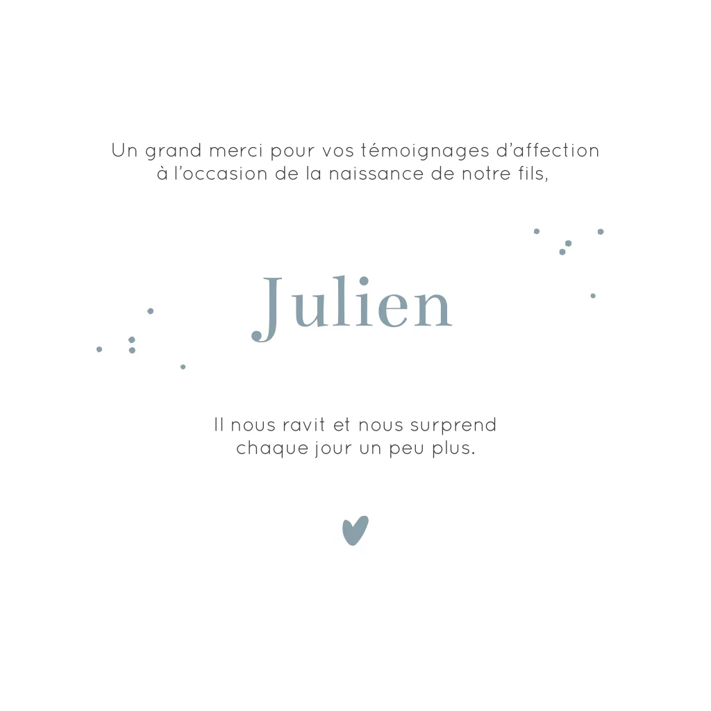 Carte de remerciement naissance avec photo et texte en bleu. Photographe: @annevgfotografie