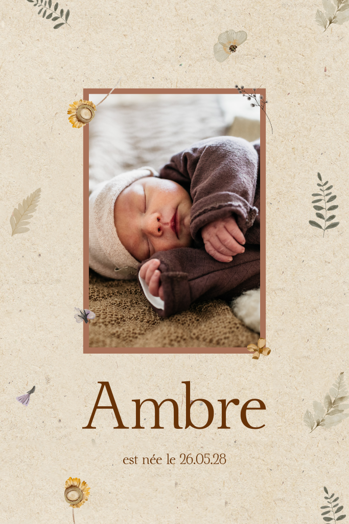 Faire-part de naissance look eco avec photo et fleurs séchées