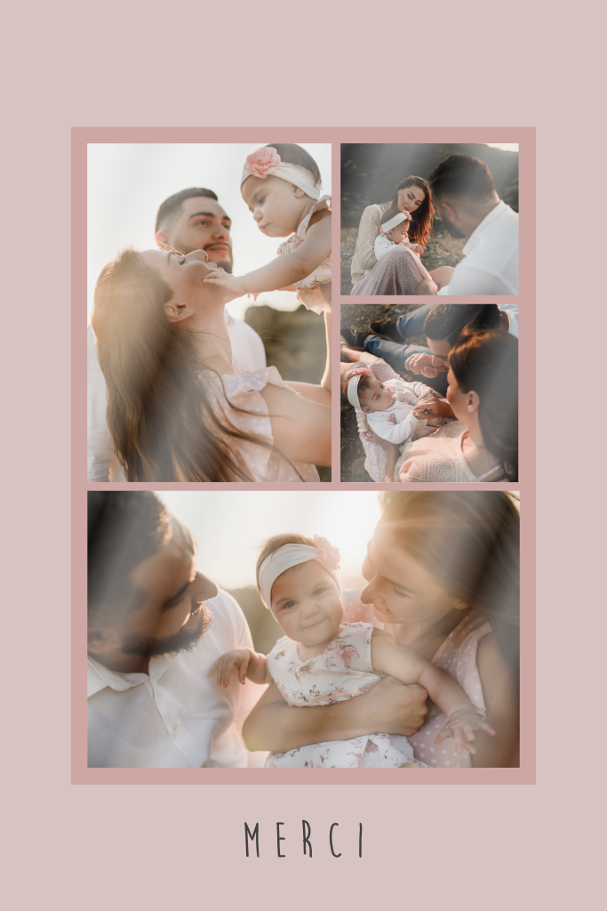 Carte de remerciement avec 4 photos et cadre rose.