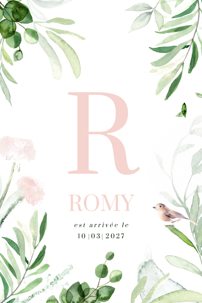 Faire-part de naissance fille avec branches et fleurs en aquarelle
