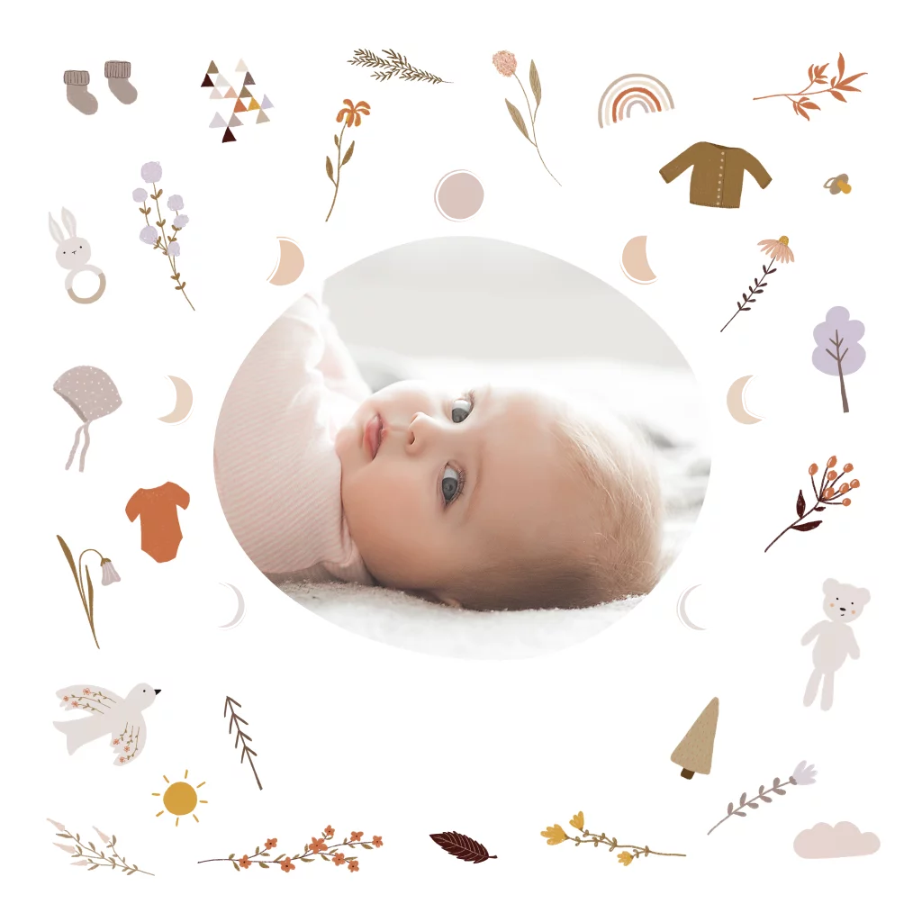Faire-part de naissance avec vêtements de bébé et fleurs