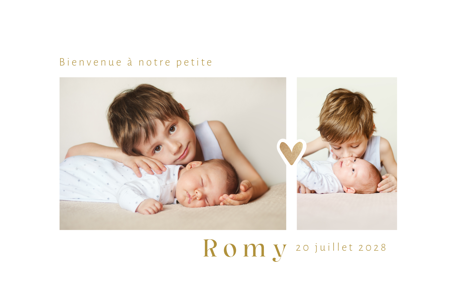 Faire-part de naissance avec photo et coeur doré en format paysage