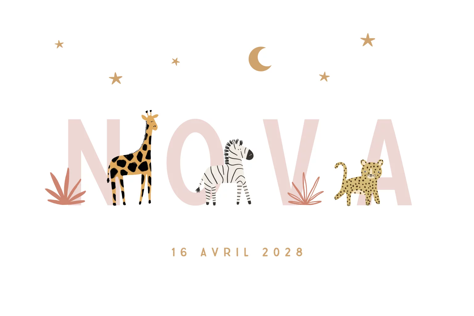 Faire-part de naissance avec animaux de la jungle et nom rose