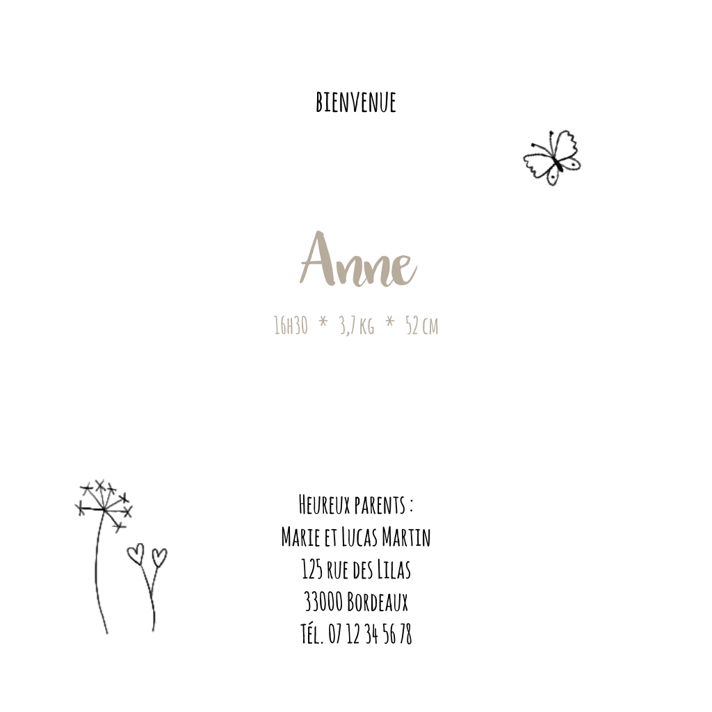 Un faire-part de naissance avec un dessin d'un mignon petit lapin entre les fleurs ! Les textes peuvent être personnalisés selon vos souhaits.