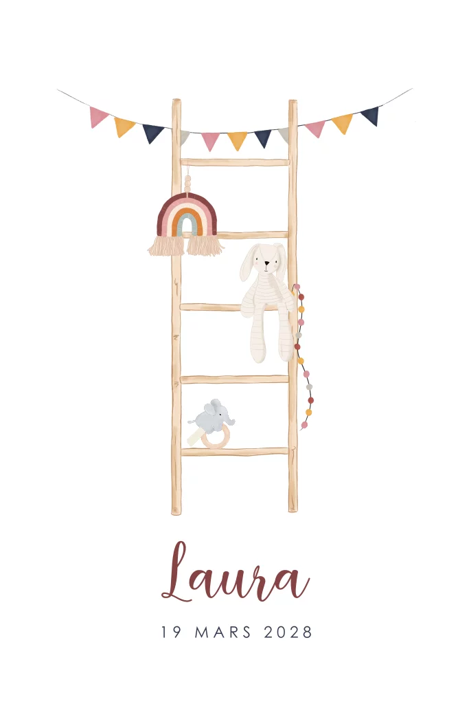 Faire-part de naissance avec échelle et guirlande illustrées.