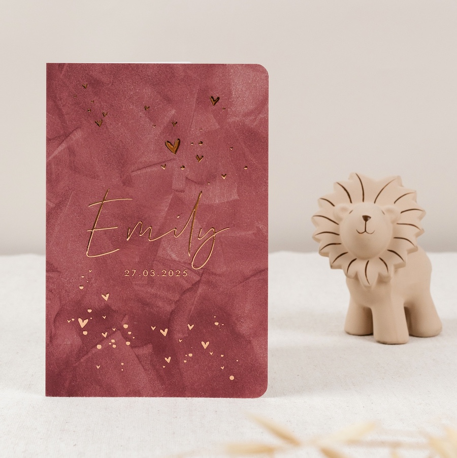 Ce faire-part de naissance luxueux annonce la venue au monde de votre fille avec douceur et élégance. Une dorure à l’or rose sur le prénom, la date de naissance et de ravissants petits cœurs font étinceler cette heureuse nouvelle, tandis que le toucher velouté du papier « soft-touch » de cette carte pliée aux coins arrondis renforce l'effet velours du fond imprimé.